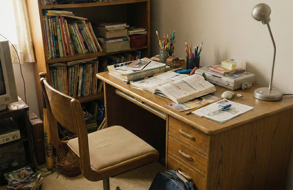 整理整頓されているとは言い難いが、この机の主はどうやら勉強熱心なのか学習用の参考書が開きっぱなしになっており、さまざまな資料が積まれている。
