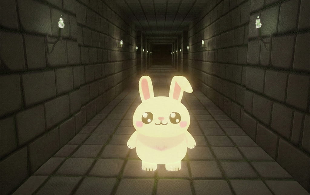 地下迷宮-モンスターが現れた- モンスターだ!…でも妙に可愛いモンスターだな。戦っていいものなのだろうか。よく見なくてもなんだか憎めないと言うか、愛らしいと言うか、思わず撫でたくなるようなルックスだ。しかし油断してはならない。ダンジョンにいるうさぎは概ね凶暴であると相場が決まっている。何より私は今丸腰なのだ。逃げるのも一つの手かもしれない。いや、場合によっては敵意を見せず、素通りしてみてもいいかもしれない。さて、どうしたものだろうか。 戦う 逃げる 無視する 撫でる Lv129/182